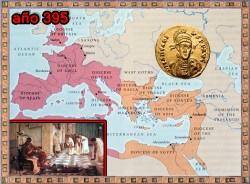 | Año 395 - Teodosio I, último emperador de todo el imperio romano unido, muere y deja como sucesores a sus dos hijos, Honorio en la mitad occidental y ARCADIO en la oriental. |