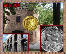 | Año 364 - Joviano muere y se proclama emperador a Valentiniano I, que gobernará la mitad occidental del imperio. Éste asocia a su hermano VALENTE, para que gobierne la mitad oriental con capital en Constantinopla. |