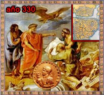 | Año 337 - Constantino I se hace bautizar, convirtiéndose en el primer emperador cristiano de la historia. En este mismo año muere, dejando por sucesores a sus tres hijos: Constantino II en el oeste, Constante I en el centro, y Constancio II en el este con capital en Constantinopla. |