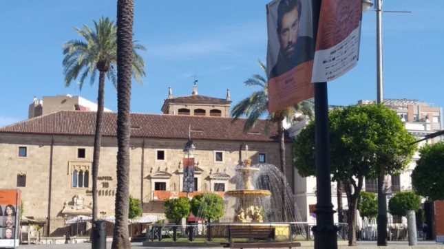 .Fotografía de la Plaza de España de Mérida en donde vemos una bonita fuente así como el Palacio de los Mendoza, que en su momento comenté algunas características del mismo.