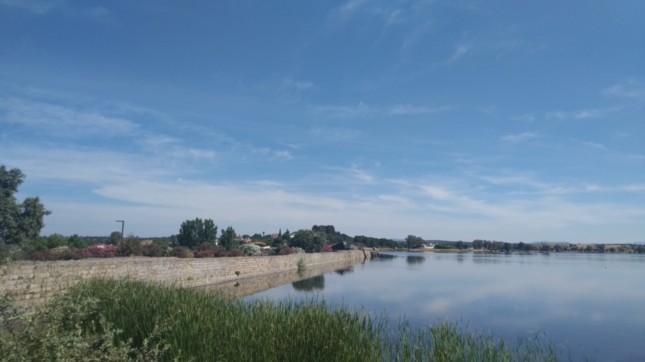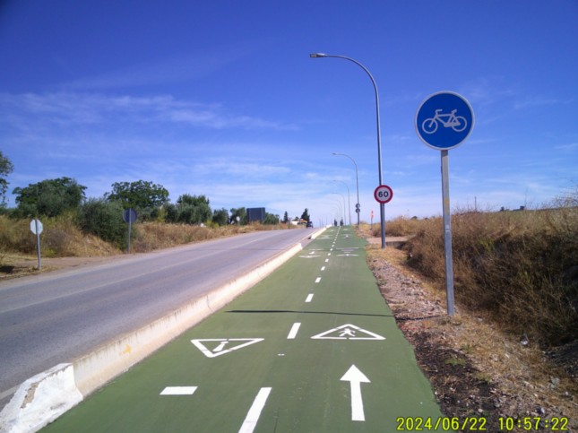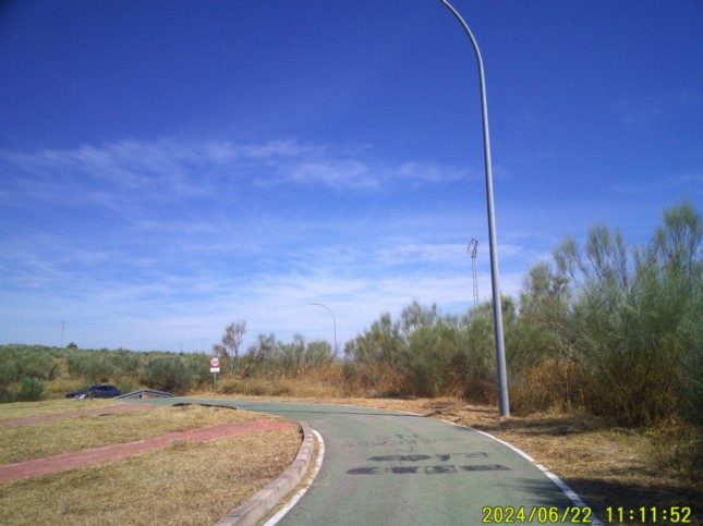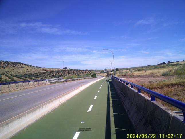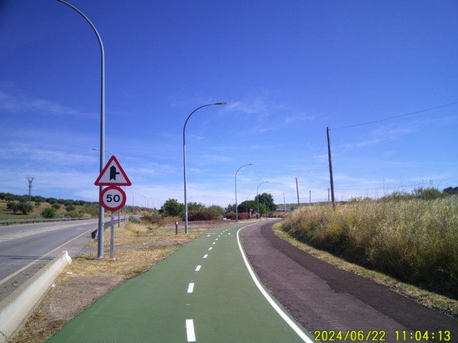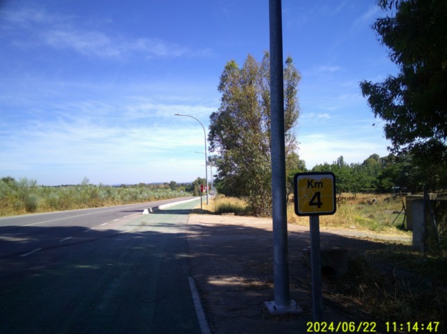 .Seguimos junto a la Avenidea del Lago a la izquierda, hasta un segundo momento en el que el carril-bici se vuelve a alejar de la avenida comentada, (km 5,175) llegando por segunda vez a la comentada avenida, junto a un hostal, (km 5,3) llamado "Villa Emerita."