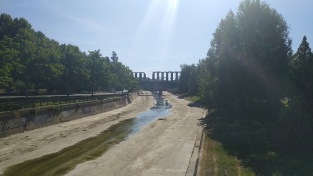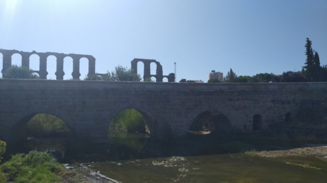 .Fotografía del cauce del río Albarragás, próximo a su deembocadura en el río Guadiana, en la que vislumbramos el Acueducto de los Milagros.