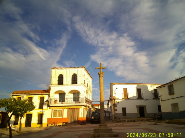 . Enseguida tomamos por la derecha la segunda calle que es la calle Don Pedro Aceituno Santos y por ella llegamos a la Plaza Mayor en cuyo centro está un crucero. (km 8)