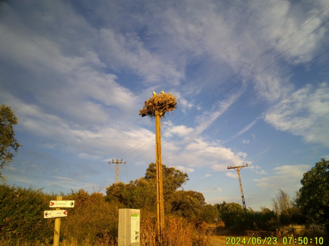 .Curiosa fotografía, al lado del puente sobre el río Ayuela en donde vemos un nido de cigüeñas anidando en lo alto de un poste de la luz.
