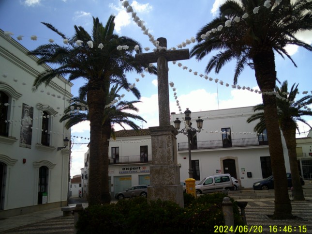 .Fotografía de la Plaza de la Constitución en cuyo centro tenemos un crucifijo peraltado sobre tres bases, tal y como vemos, pero sin mayor información sobre el mismo, viendose también la fachada de la Oficina de Turismo de esta población de Fuente de Cantos.