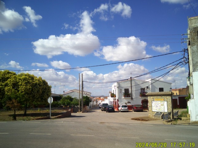 ...y tras verla y fotografiarla, llegar a la carretera de Medina de las Torres que es la BA-069, (km 0,575) girando a la izquierda y a continuación enseguida a mano derecha tomar la primera calle, Calle Fuente de Cantos, (km 0,625) que es la pista que nos llevará hasta la misma entrada de Calzadilla de los Barros, distante seis kilómetros.