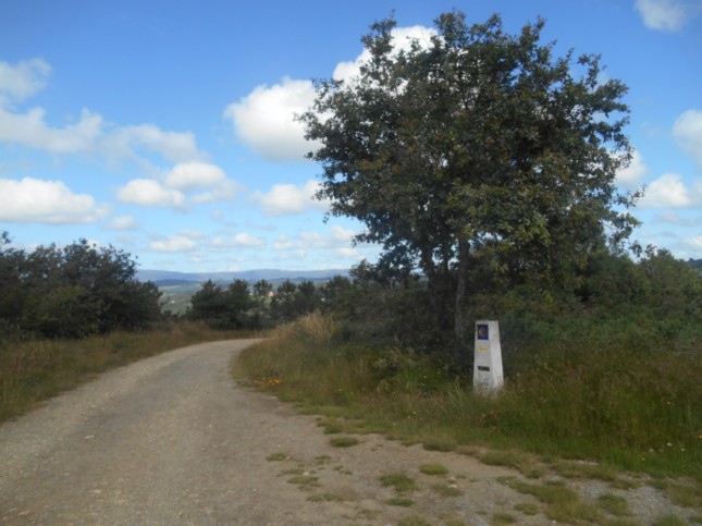 .Tras 400 m cruce de caminos con el camino Pena, asfaltado y por la derecha nos llevaría a Lalín, siguiendo recto/de frente/izquierda muy bien señalizado con un mojón jacobeo. (km 15,7)