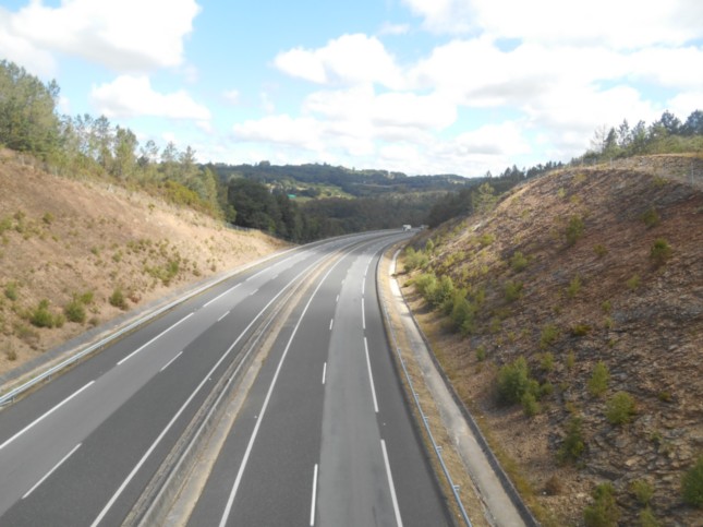 .Seguimos las señales del Camino, rectos/de frente y salimos, ya en claro descenso, con amplias vistas al viaducto y al valle del Deza, hasta llegar muy próximos a la autopista AP-53, tras 1,6 km...