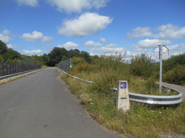 .Tras ver la estación del tren de Lalin, desandamos el trayecto hasta la rotonda, tomando a la izquierda la carretera a Baxán, correctamente indicada con un monolito del Camino. (km 13,3)