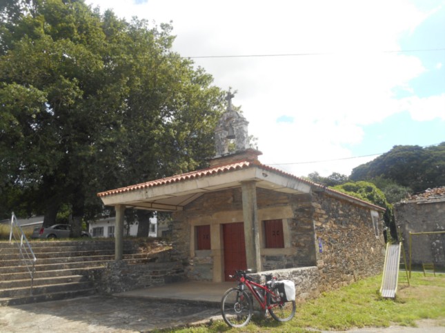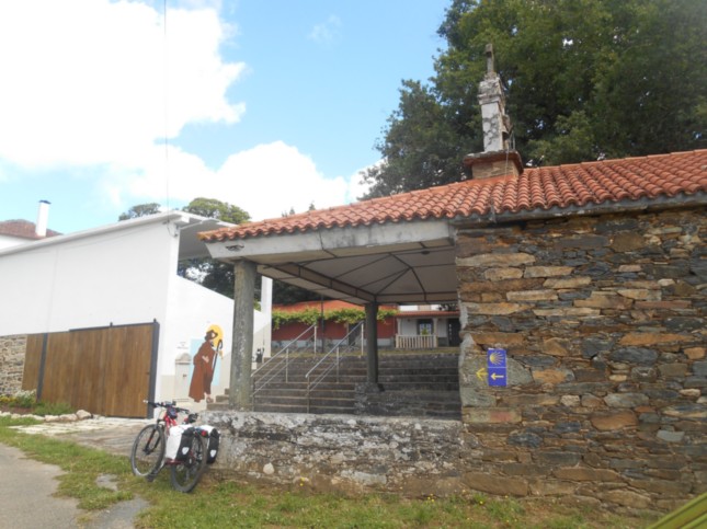 .En esta fotografía vemos dicha capela, mi bicicleta y una pintura mural de un Santiago peregrino, justo al lado de una "fonte del peregrino".