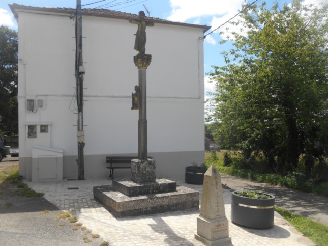.En esta población de A Xesta tenemos este cruceiro, sobre triple pedestal y este monolito que caracteriza a esta aldea como: "aldea singular" y datado en el año 2018.