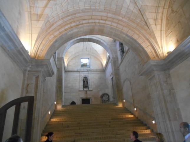 .A un lado podemos ver la escalera de honor, presidida por San Benito con varias figuras de diferentes santos, construida entre 1644 y 1647.