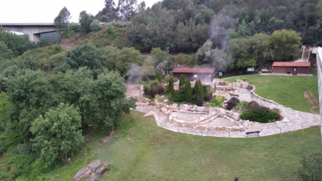 .Fotografía de las Termas de Outariz y Canedo, hecha desde una pasarela peatonal que conecta la zona de baño con la otra orilla del río, donde existe una amplia zona de aparcamiento.