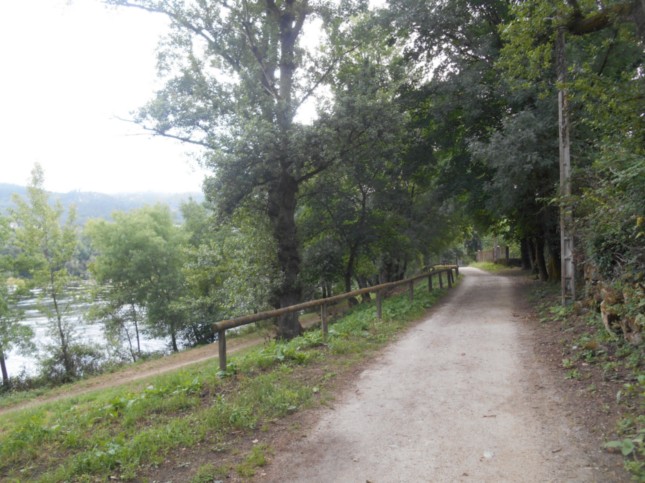 .Superé el Río Miño por ese puente/pasarela, (km 7) y por la izquierda seguí por un camino con el río Miño a mi izquierda y la OU-402 a la derecha.