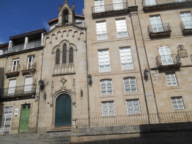.FotografÍa en esa plaza de la Iglesia de las Carmelitas Descalzas en Orense y del edificio colindante, blasonado y sin mayor información sobre ellos.