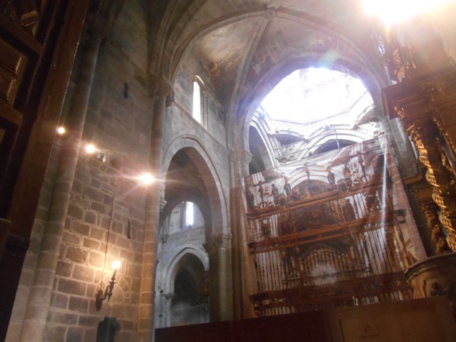 .Es gracias a la posterior restauración, en el siglo XV, que actualmente se pueden apreciar notables muestras románicas como los fustes de mármol sobre los que descansan decoradas arquivoltas con motivos ornamentales provenientes de la escuela del Maestro Mateo y el patín de época románica en el que se halla la Puerta de la Misericordia.