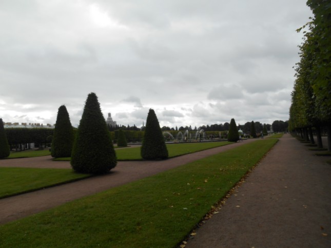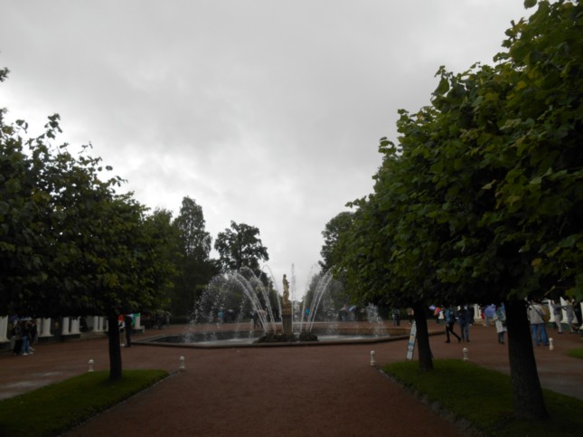 Fotografía de uno de los paseos que hay en el Parque Inferior del Palacio Peterhof, con la fuente de Venus.