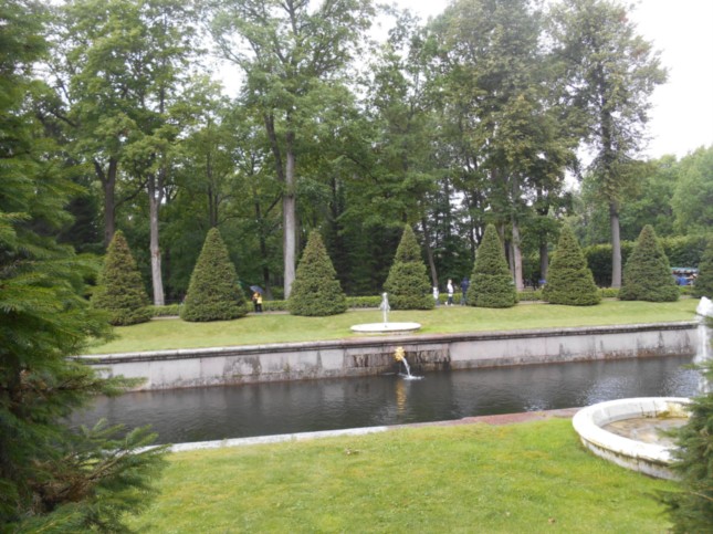 Fotografía en la que se aprecian abetos podados en forma de conos y el canal que lleva el agua de la Gran Cascada al Báltico.