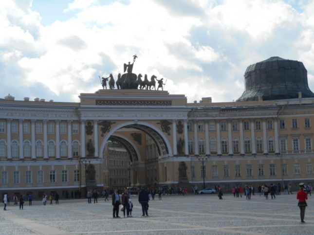 Fotografía muy lograda del arco de la Plaza del Ermitage y de las cuadrigas que descansan sobre el mismo.