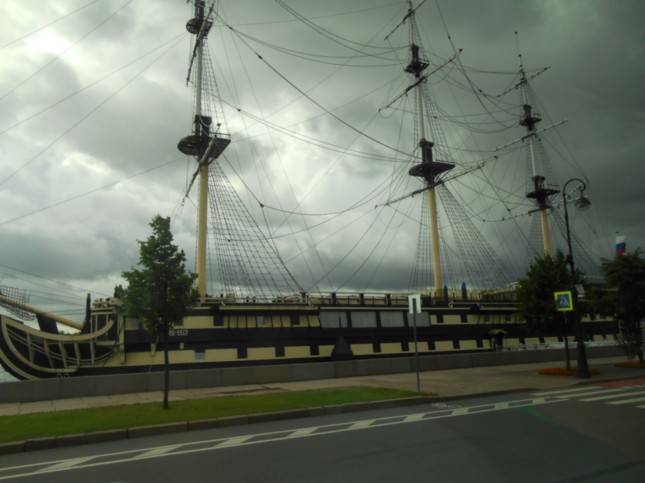 Al lado de esta escuela naval, está el crucero Aurora, anclado en el puerto.