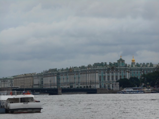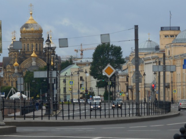 Fotografía ahora del río Neva, del muelle inglés, del puente Blagoveshchenskiy y la cúpula de la iglesia ortodoxa, Catedral Naval de San Nicolás, que no visitamos.