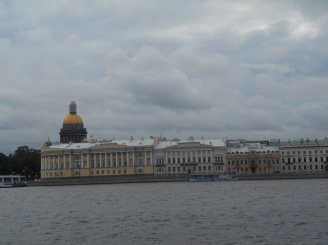 Fotografía de un edificio neoclásico en el embarcadero de la Universidad, ya en el autobús para visitar el Ermitage.