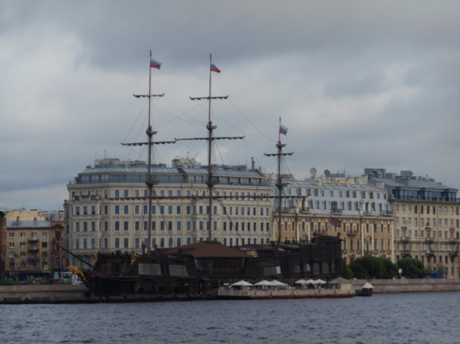 Desde Strelka de la isla Vasílievski, esta fotografía de aquel barco que es un bar/restaurante, anclado sobre la orilla del río Neva.