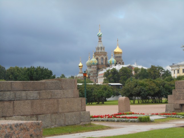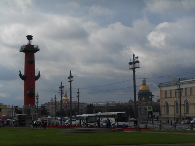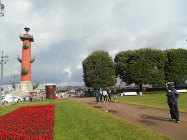 Fotografía desde el mismo parque, viéndose en la misma uno de los faros, y las cúpulas del Almirantazgo en el centro y la de la catedral de San Isaac a la derecha.