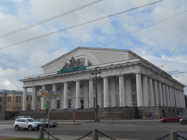 El edificio, que se sitúa en la plaza de la Bolsa es un ejemplo significativo de la arquitectura neoclásica de inspiración griega. Diseñado por el arquitecto francés Thomas de Thomon e inspirado en el templo de Hera en Paestum, el edificio se construyó entre 1805 y 1810. Se construyó para alojar a la Bolsa de San Petersburgo, aunque posteriormente ha tenido otros usos. Actualmente alberga el Museo Naval Central.