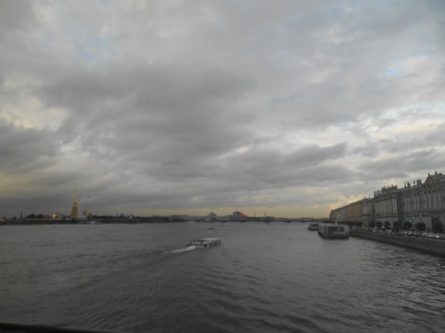 Desde uno de los puentes sobre el río Neva, fotografía del mismo río, teniendo a la derecha el Museo del Ermitage y a la izquierda la Fortaleza de San Pedro y San Pablo que en su momento comentaré..., desde el mismo autobús en aquella visita panorámica.