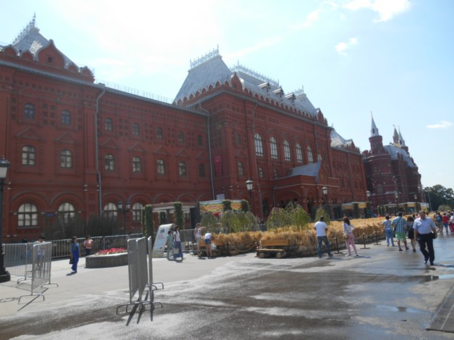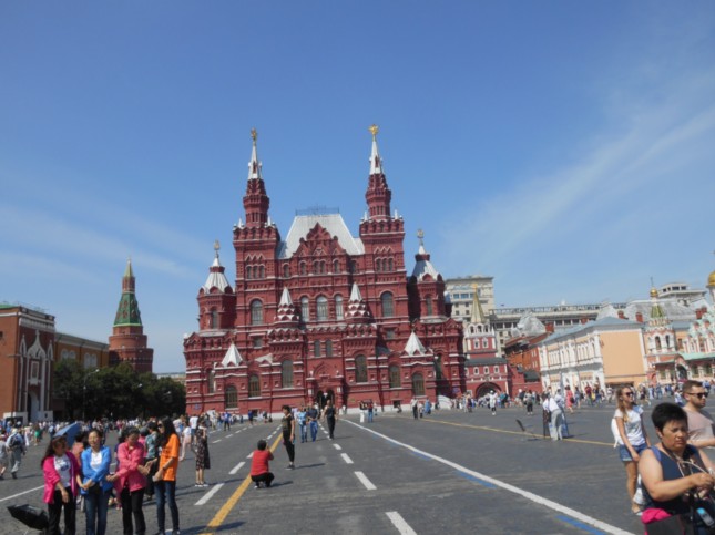 Fotografia de la fachada delantera de El Museo Estatal de Historia pero ya en la Plaza Roja.