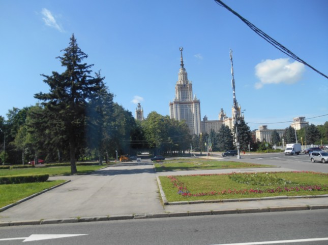 Su estampa se recorta en el cielo moscovita como surgiendo de la nada, ya que en esa área escasamente urbanizada no tiene otros edificios cerca. La torre principal tiene 36 pisos y las inmensas alas laterales albergan facultades y gran cantidad de instalaciones.