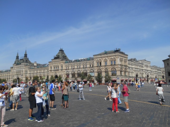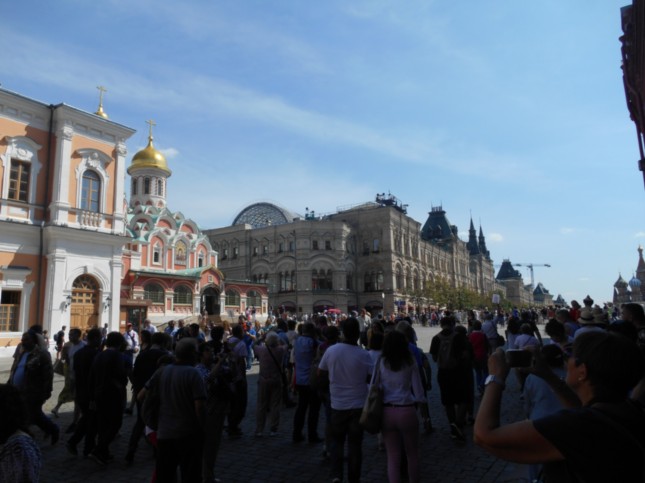 Tras entrar en la Plaza Roja, esta fotografía donde se aprecia a la izquierda la Catedral de Kazán de Moscú y an el centro de la misma edificios que son utilizados como centros comerciales.