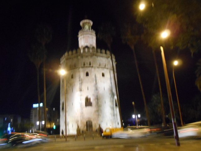 Torre del Oro, iluminada, donde teníamos aue esperar al autobús que nos recogería para llevarnos al hotel.