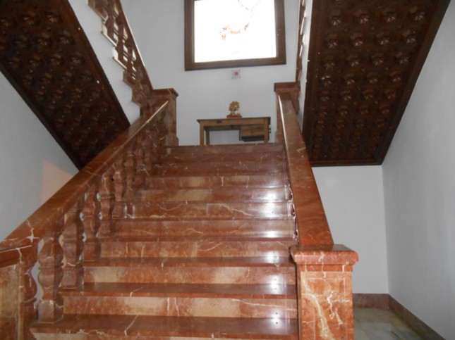 Desde aquellas escaleras de mármol, esta fotografía de aquella chimenea de madera y de la habitación donde está ubicada.