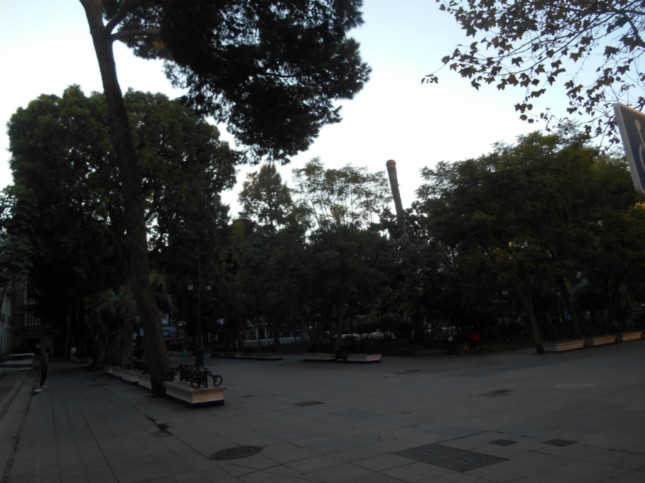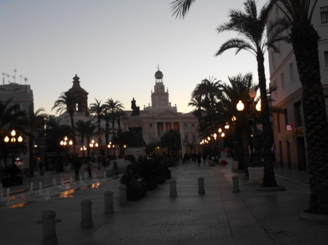 Ya anocheciendo, esperando al autobús para el regreso al hotel donde pernoctábamos, fotografía de la plaza de San Juan de Dios, con vistas del Ayuntamiento y de la iglesia homónima.