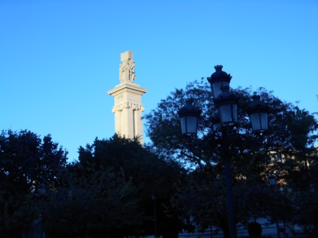 Ya en la Plaza de España, fotografía de la parte alte de ese monumento a la Constitución de 1812.