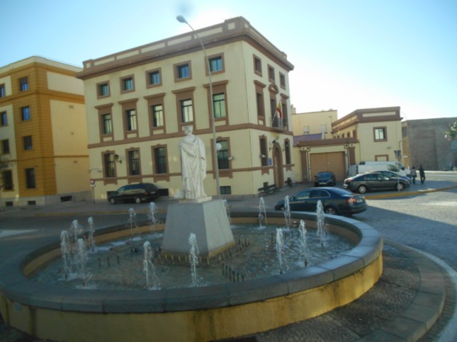 Por la calle Murallas de San Roque, llegamos a esta rotonda donde está la fuente de Lucio Cornelio Balbo.