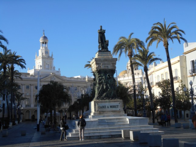 Fotografía en primer término del monumento a Segismundo Moret y en la misma, se ve el Ayuntamiento de Cádiz asi como la cúpula de la catedral de Cádiz.
