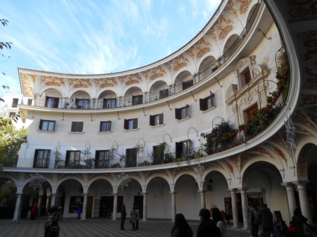 Sobre las arcadas hay edificadas hasta tres plantas. En el interior de la plaza semicircular se encuentra una fuente, diversos comercios y un paño de la muralla de Sevilla de unos 50 m. Se caracteriza por ser una plaza muy tranquila y silenciosa en contraste con su situación, con excepción de las mañanas de los domingos en los que en la plaza se celebra el mercadillo de numismática y filatelia donde poder adquirir sellos, billetes, monedas, medallas, minerales, insignias militares y otros productos destinados a coleccionistas.
