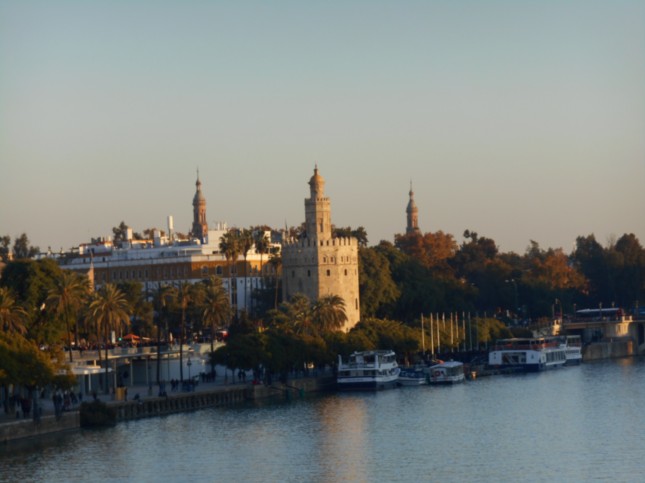 Desde el margen del Barrio de Triana, fotografía del rio Guadalquivir, de la Torre del Oro y de la Giralda de la catedral de Sevilla.