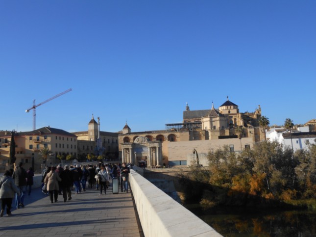 Tras la comida, ahora en grupo para ver la Mezquita por dentro y una visita guiada por el centro turístico de la población, caminando sobre el Puente Romano,teniendo de frente La Mezquita, El Arco del Triunfo, el Triunfo de San Rafael y el Obispado de la Diócesis de Córdoba, vista de derecha a izquerda.