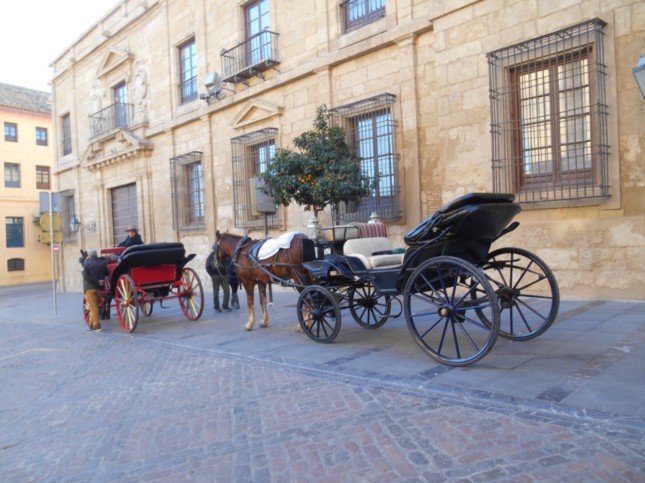 En la calle Torrijos, al lado de la fachada del Obispado de La Diócesis de Córdoba y frente a las Puertas del Sabat y de San Ildefonso de la Mezquita-Catedral, carruajes para hacer el recorrido turístico en ellos.