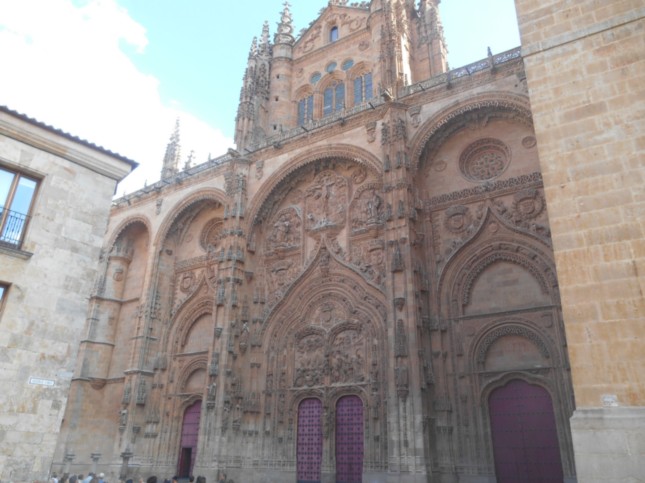 La portada de la iglesia es uno de los más bellos ejemplos de plateresco. Está concebida como portada-retablo formando un arco de triunfo bajo cuya bóveda de medio cañón se despliega la abundante decoración característica del estilo.