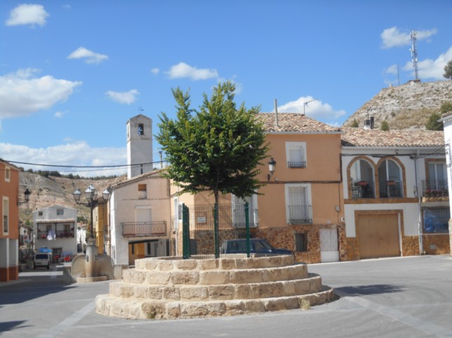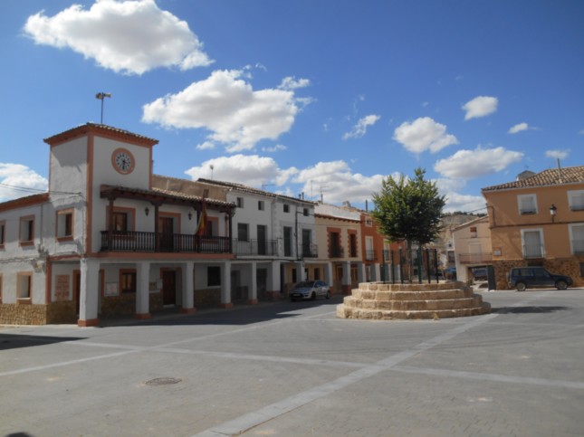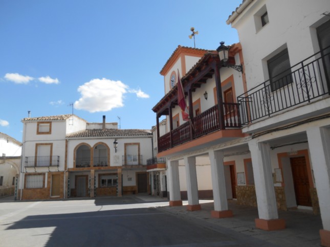En esta fotografía, vemos la Plaza Mayor, con el pedestal donde antes se ubicaba el Olmo Legendario, ahora un pequeño olmo y el Ayuntamiento de Torralba, edificio moderno que se caracteriza por su torre del reloj, una balconada de madera en el primer piso y balaustrada en la planta baja.