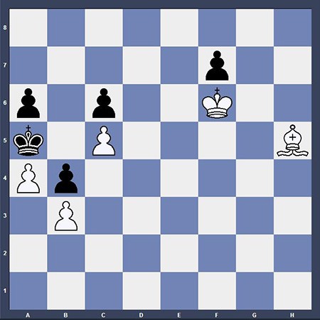 Por alguna razón se encuentra el alfil ahi , además el peon de c5 necesita siete movidas para coronar ( 4 del rey blanco) y 3 del peoncito . En cambio al moverse el rey el peon negro de f necesita 5 movimientos para promocionar no creo que la solución sea esa. De todos modos hay que dejar avanzar al peon c negro para no quedar ahogado , por ahi va la solución ...
