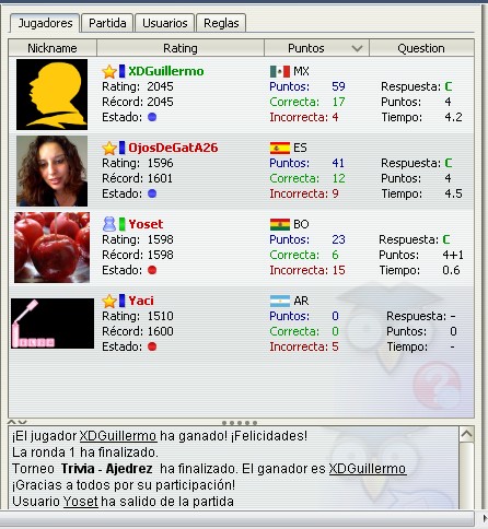 Por otra lado una cosa es contestar en sala trivia preguntas de lo más obvias, y otra contestar cosas infames en sala de ajedrez, sin embargo, no entiendo como es que en sala trivia hacen 17 aciertos, y en sala de ajedrez invariablemente hacen 20 o 21 aciertos... raro no?? Seré mas claro ahora... lo que dije fue lo siguiente "baseros en sala de ajedrez al mismo tiempo que memorizan preguntas faciles en sala de trivia"