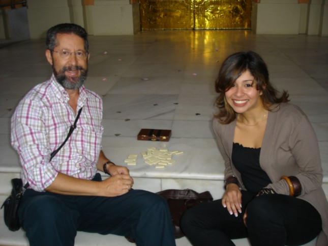 Una partida de dominó en la mismísima puerta del Ayuntamiento de Sevilla, con mi amiga buhonera Yie.